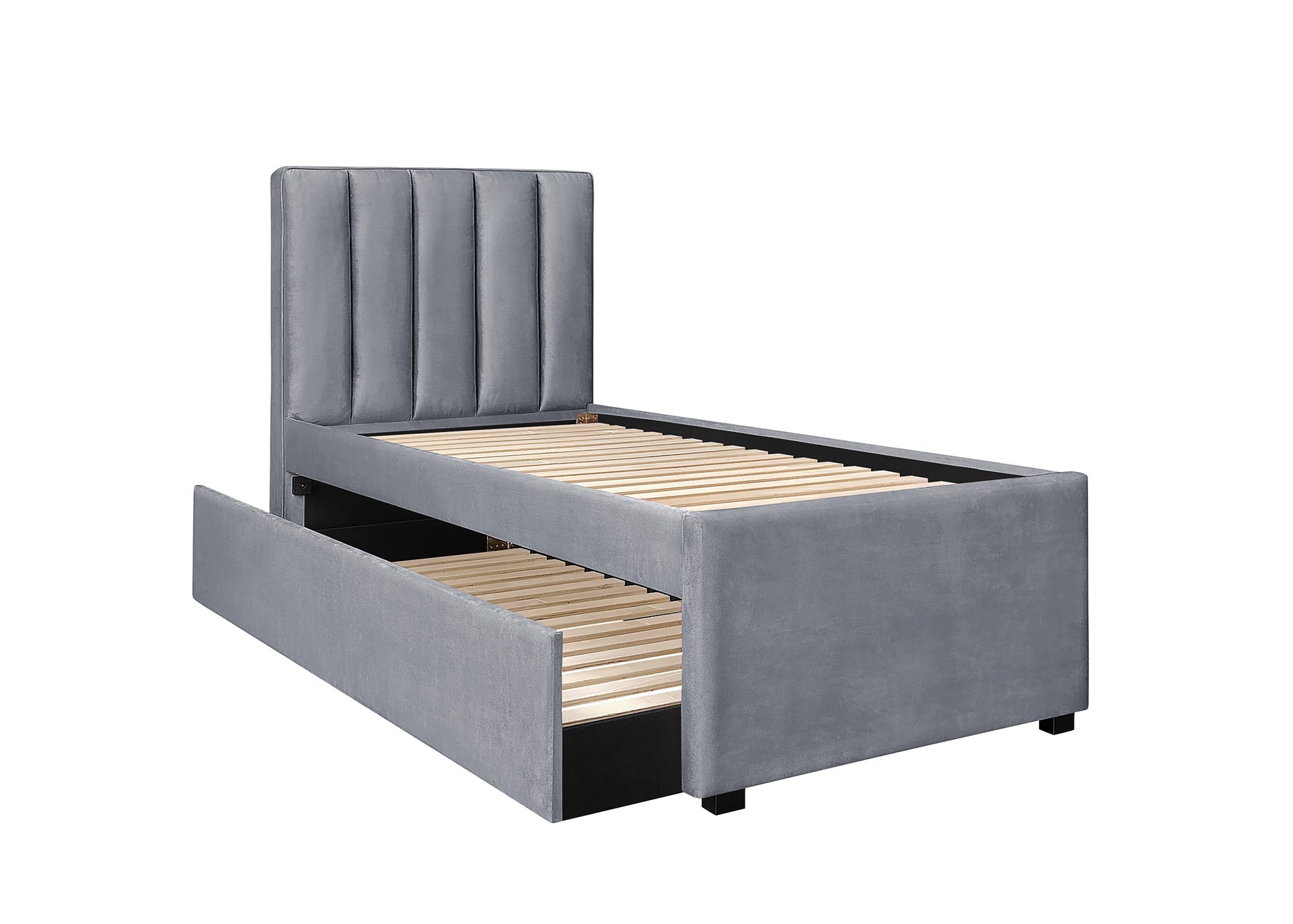 rozmery: 96/221/122 cm; manželská posteľ s vysúvacím spodným matracom; materiál: látka - zamat, farba: šedá; * posteľ bez matraca,